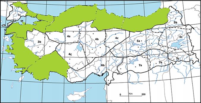 | Istranca Bölümü, Çatalca-Kocaeli Bölümü, Güney Marmara Bölümü, Batı Karadeniz Bölümü, Orta Karadeniz Bölümü, Doğu Karadeniz Bölümü, Asıl Ege Bölümü, Antalya Bölümü, |